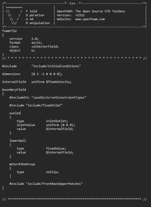 In particular the image is referred to the U file, but all of them have the same structure. The file is like a key-value dictionary where the first key encountered is dimension, following internalField and boundaryField (we skipped the "#include" for now) . The dimension, as we can imagine, define the physical dimensional unit of the field. The array [ ... ] has 7 slots that represent 7 different units in this order: